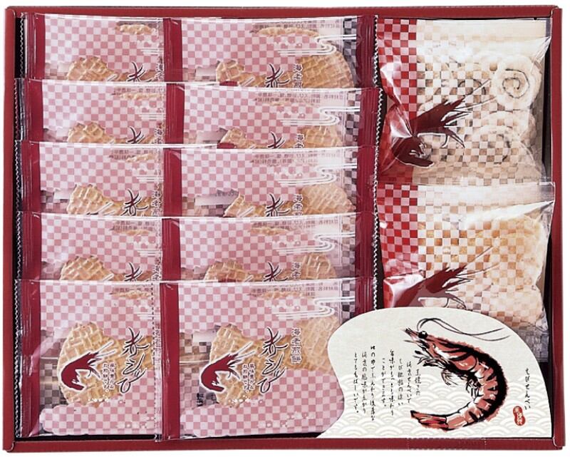 商品内容:赤えびせんべい(1枚入)×10、えびせん(うず巻・えび松風)10g×各1