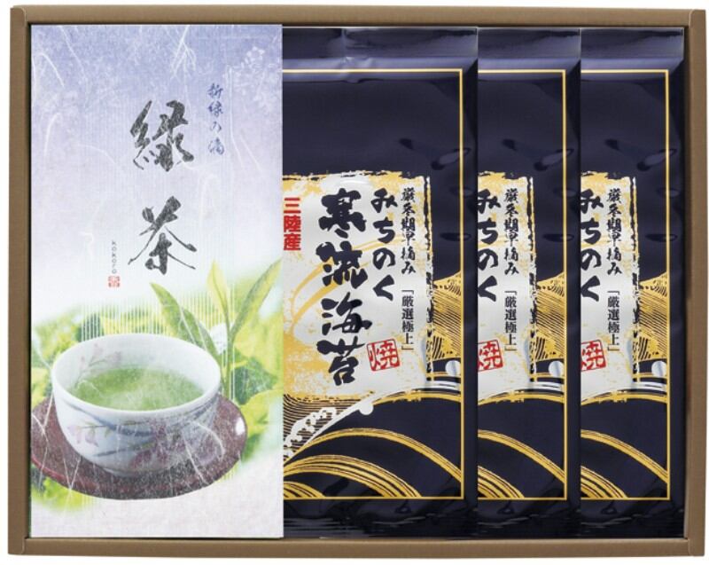商品内容:焼のり半切5枚(三陸産)×3、煎茶60g(鹿児島茶)×1