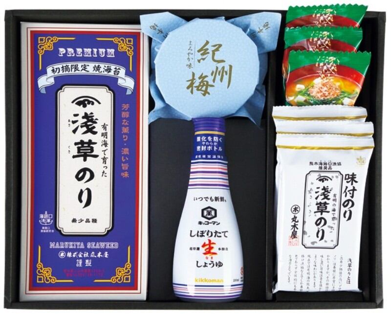商品内容:浅草焼のり(半切5枚2袋)・紀州南高梅100g・キッコーマンしぼりたて生しょうゆ200ml×各1、浅草味付けのり(8切8枚)・マルトモフリーズドライ味噌汁ほうれん草7.5g×各3