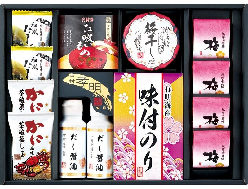 商品内容:中村孝明監修(だし醤油100ml・たまごすーぷ)・かに風味茶碗蒸しの素(2食分)×各2、味付のり(8切8枚×2)・お吸いもの(2.5g×5)・紀州梅干し70g×各1、紀州梅干し1粒×4