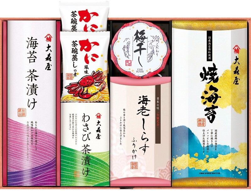 商品内容:焼海苔(8切8枚×2)・海苔茶漬け(5.4g×4)・わさび茶漬け(5.6g×2)・海老しらすふりかけ(3g×3)・紀州梅干し70g×各1、かに風味茶碗蒸しの素(2食分)×2