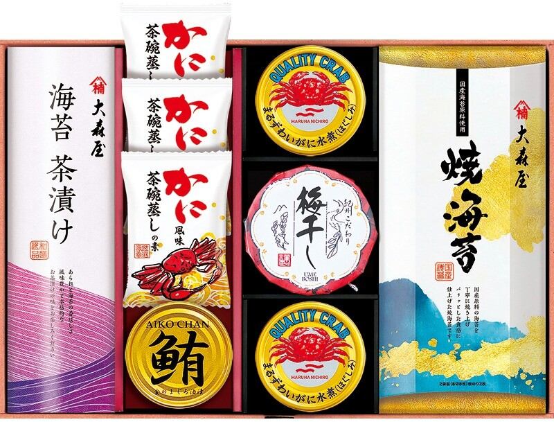 商品内容:焼海苔(8切8枚×2)・海苔茶漬け(5.4g×4)・紀州梅干し70g・鮪油漬フレーク70g×各1、かに風味茶碗蒸しの素(2食分)×3、まるずわいがにほぐしみ55g×2