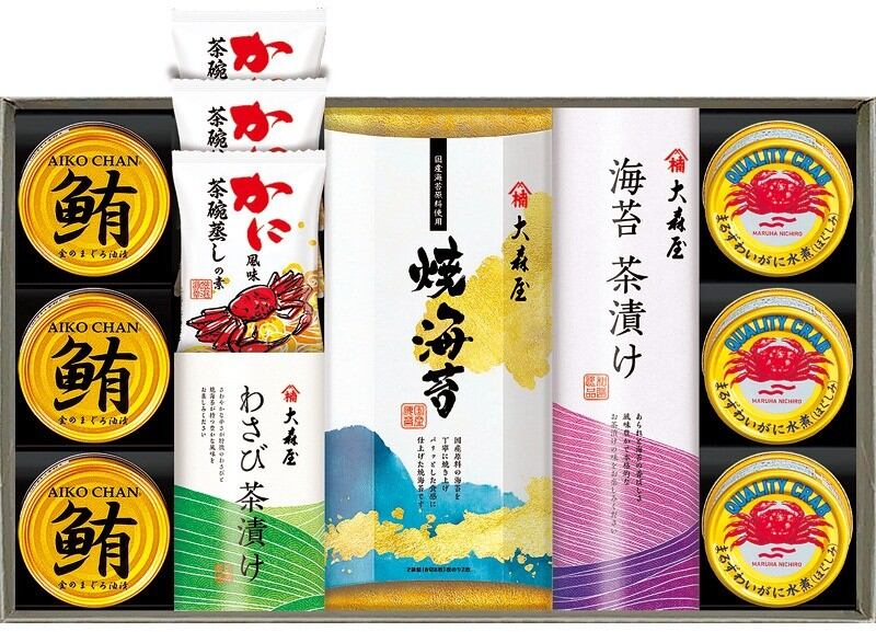 商品内容:焼海苔(8切8枚×2)・海苔茶漬け(5.4g×4)・わさび茶漬け(5.6g×2)×各1、かに風味茶碗蒸しの素(2食分)・まるずわいがにほぐしみ55g・鮪油漬フレーク70g×各3
