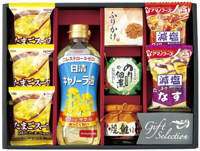 商品内容:日清キャノーラ油350g・アマノフーズ減塩いつものおみそ汁(なす・なめこ)・ニッスイ焼鮭ほぐし50g・島の香 のり佃煮80g・丸美屋 さけふりかけ(2入)×各1、宝幸 たまごスープ×3