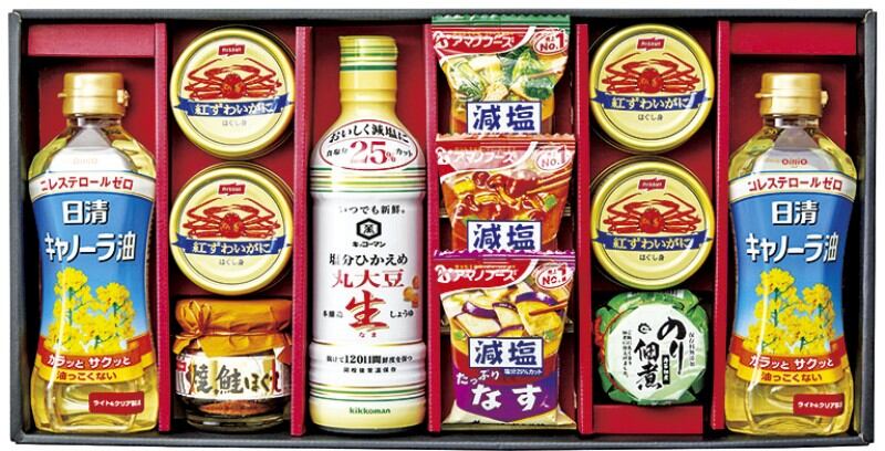 商品内容:日清キャノーラ油350g×2、キッコーマン塩分ひかえめ丸大豆生しょうゆ450ml・アマノフーズ減塩いつものおみそ汁(なす・なめこ・ほうれん草)・ニッスイ焼鮭ほぐし50g・島の香 のり佃煮80g×各1、ニッスイ紅ずわいがにほぐし身55g×4
