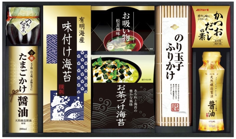 商品内容:島の香のり佃煮80g・有明海産味付け海苔(3切4枚)・永谷園お吸い物松茸風味(2.3g×4)・永谷園お茶づけ海苔(4.7g×5)・のり玉子ふりかけ(4.5g×3)・マルトモかつおだしの素(4g×4)・伊賀越(たまごかけ醤油・天然醸造しょうゆ)200ml×各1