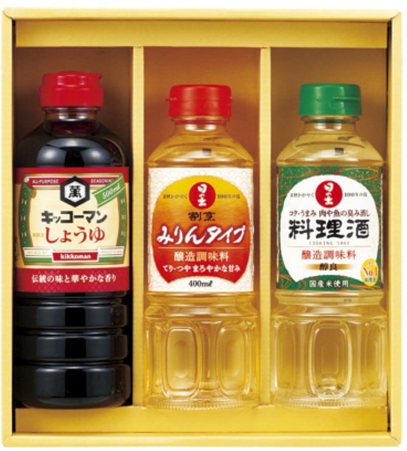 商品内容:キッコーマンこいくちしょうゆ500ml・日の出料理酒400ml・日の出割烹みりんタイプ400ml×各1