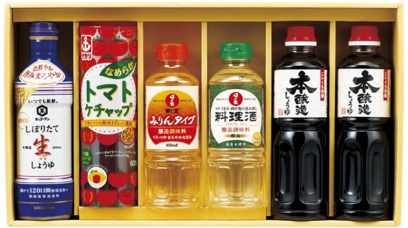 商品内容:サンビシ本醸造しょうゆ500ml×2、キッコーマンいつでも新鮮しぼりたて生しょうゆ450ml・イカリなめらかトマトケチャップ280g・日の出料理酒400ml・日の出割烹みりんタイプ400ml×各1