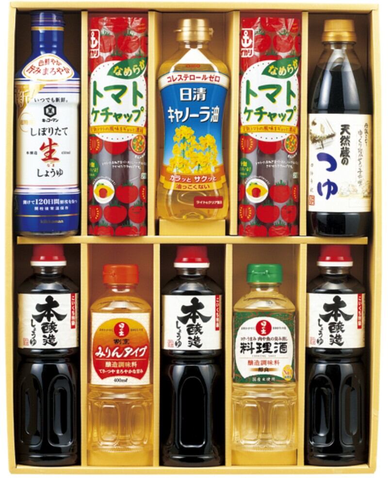 商品内容:サンビシ本醸造しょうゆ500ml×3、イカリなめらかトマトケチャップ280g×2、日清キャノーラ油350g・キッコーマンいつでも新鮮しぼりたて生しょうゆ450ml・伊賀越天然蔵のつゆ500ml・日の出料理酒400ml・日の出割烹みりんタイプ400ml×各1