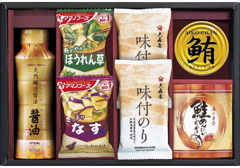 商品内容:大森屋味付のり(8切5枚)×2・アマノフーズいつものおみそ汁(なす・ほうれん草)・天然醸造醤油200ml・鮭めんたいこふりかけ(4g×3)・鮪油漬フレーク70g×各1