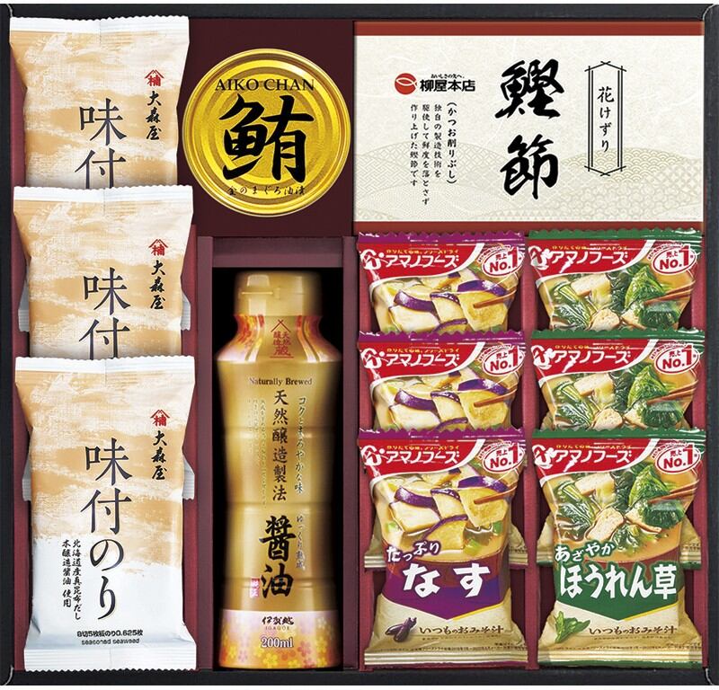 商品内容:アマノフーズいつものおみそ汁(なす・ほうれん草)・大森屋味付のり(8切5枚)×各3、天然醸造醤油200ml・柳屋本店かつおパック(3g×3)・鮪油漬フレーク70g×各1