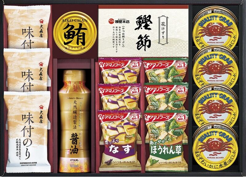商品内容:アマノフーズいつものおみそ汁(なす・ほうれん草)・大森屋味付のり(8切5枚)×各3、まるずわいがにほぐし身55g×4、天然醸造醤油200ml・柳屋本店かつおパック(3g×3)・鮪油漬フレーク70g×各1
