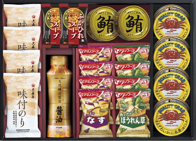 商品内容:アマノフーズいつものおみそ汁(なす・ほうれん草)・大森屋味付のり(8切5枚)・まるずわいがにほぐし身55g×各4、鮪油漬けフレーク70g・ふかひれ風スープ×各2、天然醸造醤油200ml×各1