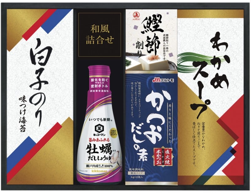 商品内容:白子味のり(3切5枚)・鰹節削り(1.5g×2)・マルトモかつおだしの素(4g×6)・わかめスープ(5.3g×4)・キッコーマン牡蠣だししょうゆ200ml×各1