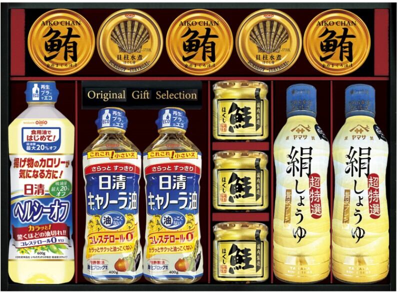 商品内容:ヤマサ絹しょうゆ450ml・日清キャノーラ油400g・宝幸貝柱水煮ほぐし身65g(固形量35g)×各2、鮭ほぐし50g・まぐろ油漬け70g×各3、日清ヘルシーオフ600g×1