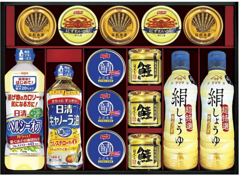 商品内容:ヤマサ絹しょうゆ450ml・ニッスイ紅ずわいがにほぐし身55g×各2、鮭ほぐし50g・宝幸貝柱水煮ほぐし身65g(固形量35g)・ニッスイさば水煮150g×各3、日清キャノーラ油400g・日清ヘルシーオフ600g×各1