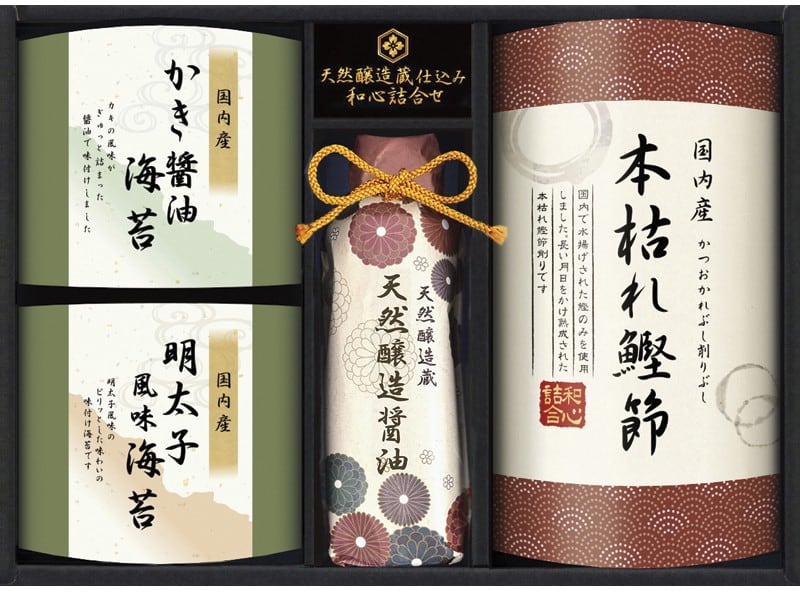 商品内容:牡蠣醤油海苔(8切6枚)・明太子風味海苔(8切6枚)・天然醸造蔵仕込み天然醸造醤油200ml×各1、本枯れ鰹節2g×3