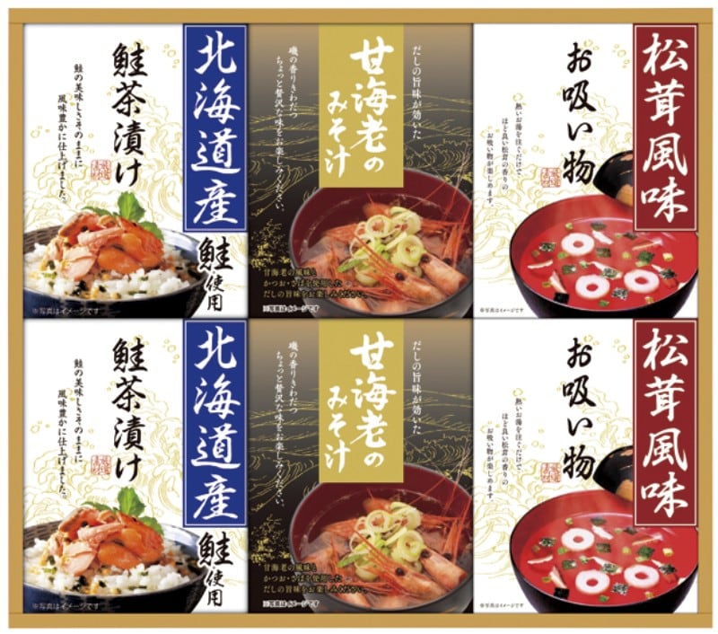 商品内容:甘海老みそ汁(7.5g×3)・北海道産鮭茶漬け(4g×3)・永谷園松茸風味お吸い物(2.3g×4)×各2