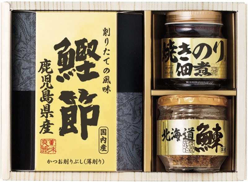 商品内容:北海道産鰊フレーク50g・焼きのり佃煮85g・鹿児島県産鰹節(2g×3)×各1