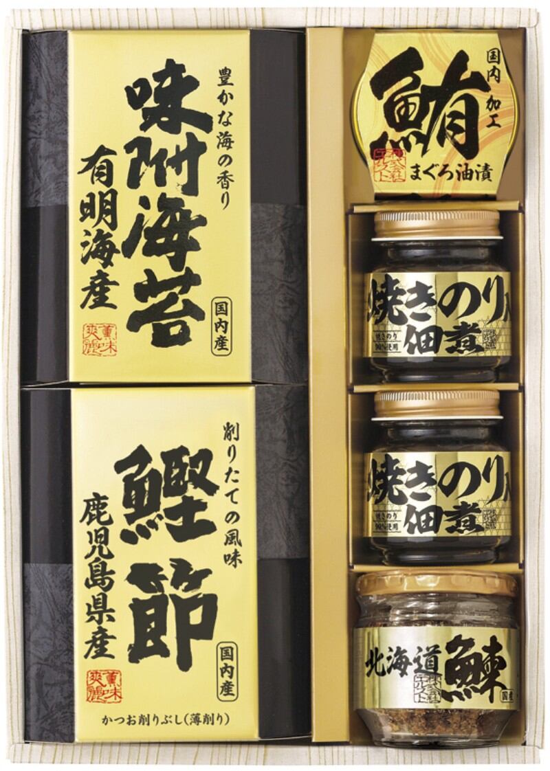 商品内容:北海道産鰊フレーク50g・鹿児島県産鰹節(2g×3)・有明海産味附海苔(8切10枚)・まぐろ油漬け70g×各1、焼きのり佃煮85g×2
