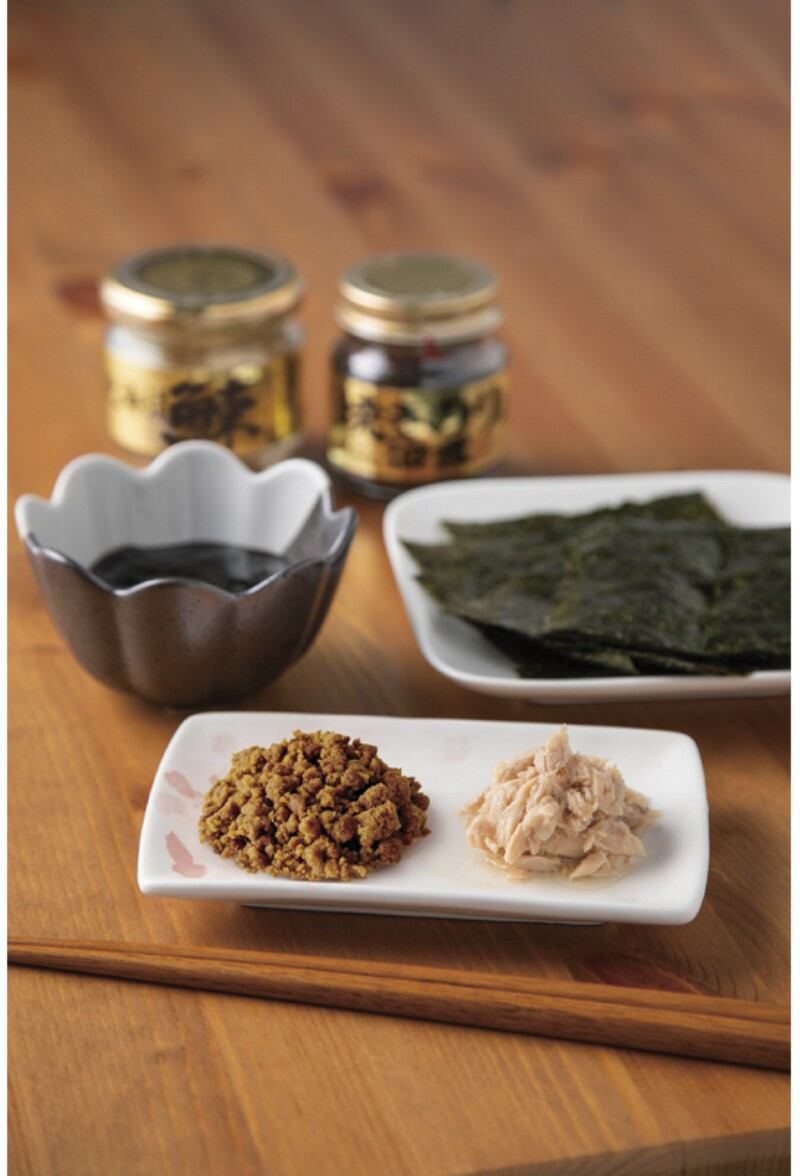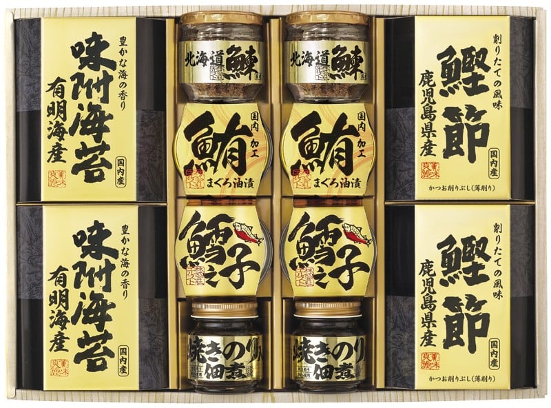 商品内容:北海道産鰊フレーク50g・焼きのり佃煮85g・鹿児島県産鰹節(2g×3)・有明海産味附海苔(8切10枚)・まぐろ油漬け70g・鱈之子味付け70g×各2