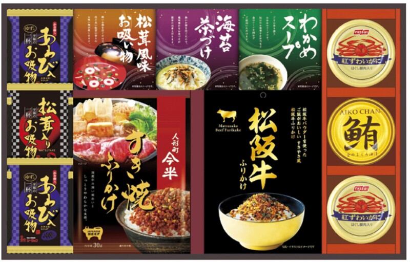 商品内容:人形町今半すき焼きふりかけ30g・松阪牛ふりかけ30g・鮪油漬フレーク70g・丸美屋のり茶漬け(6g×2)・永谷園松茸風味お吸い物(2.3g×2)・わかめスープ(3.5g×3)・松茸入りお吸い物4.2g×各1、紅ずわいがにほぐし身55g・あわび入お吸い物4g×各2