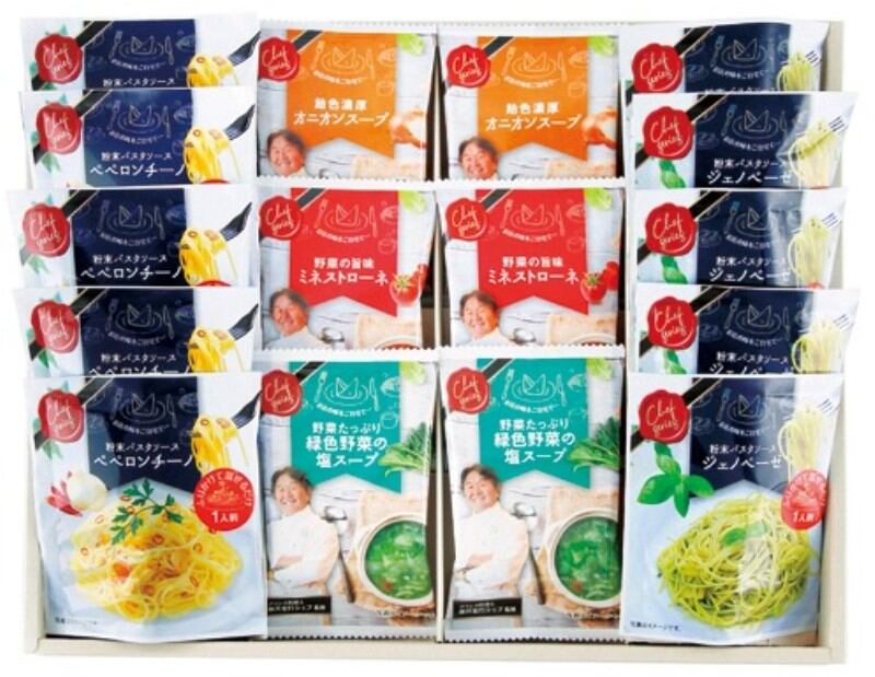 商品内容:オニオンスープ・ミネストローネ・緑色野菜の塩スープ×各2、粉末パスタソース(ジェノベーゼ・ペペロンチーノ)×各5