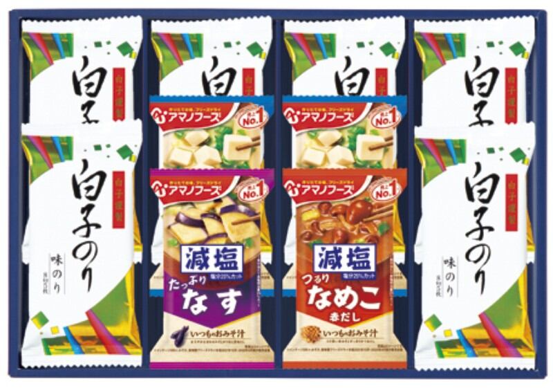 商品内容:白子のり味のり(8切5枚)×6、減塩いつものおみそ汁(とうふ)10.3g×2、減塩いつものおみそ汁(なす)9g・減塩いつものおみそ汁(なめこ)8g×各1