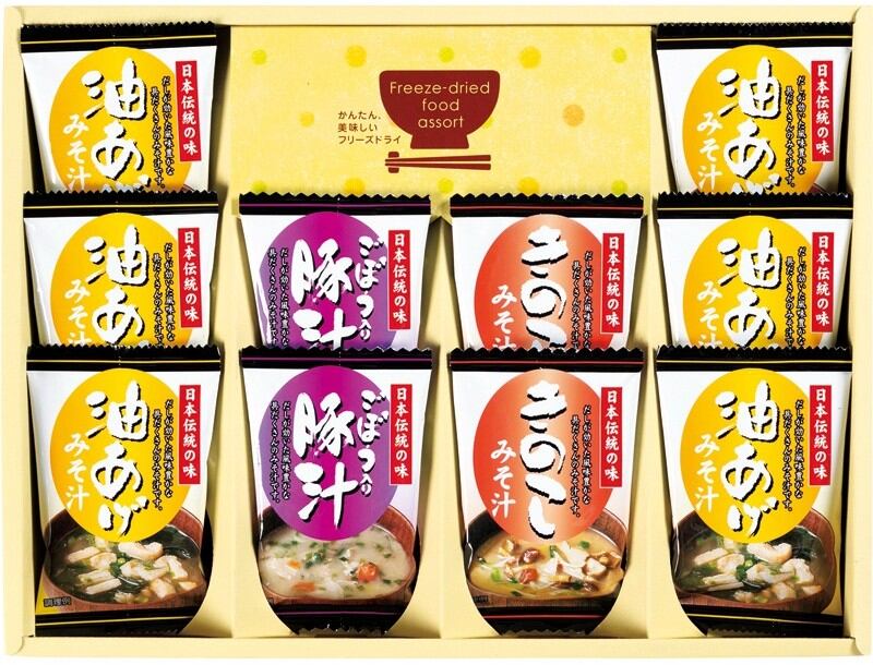 凍結乾燥の技術でお湯を注ぐだけでおいしさそのままのお味噌汁詰合せ。油あげとわかめを使い、和風だしを効かせた定番の油あげ味噌汁。3種のきのこを使い、米みそと豆みそをブレンドした風味豊かなきのこ味噌汁。豚肉と野菜の旨味にごぼうの食感がマッチした、コク深い味わいの豚汁。お味噌汁4種の味詰合せです。