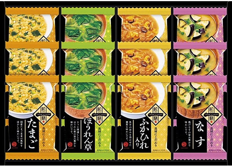 商品内容:ほうれん草お味噌汁7.1g・たまごスープ5.6g・なすお味噌汁7g・ふかひれスープ6.3g×各3