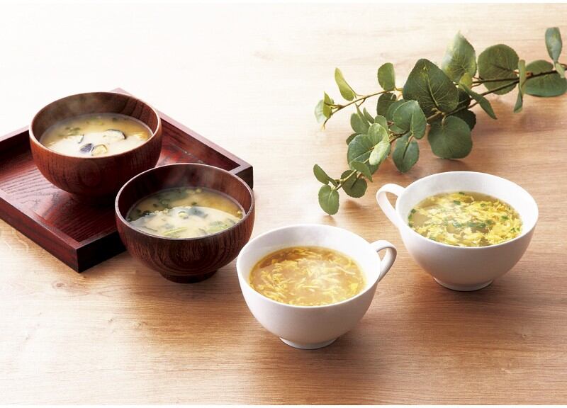 商品内容:たまごスープ5.6g×8、ほうれん草お味噌汁7.1g・なすお味噌汁7g・ふかひれスープ6.3g×各4