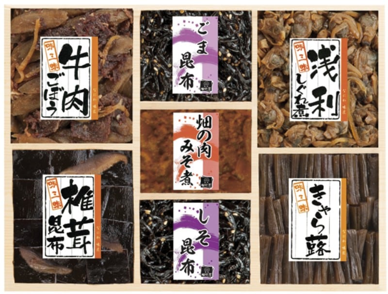 商品内容:牛肉ごぼう50g・椎茸昆布60g・ごま昆布30g・畑の肉みそ煮30g・しそ昆布30g・浅利しぐれ煮50g・きゃら蕗60g×各1