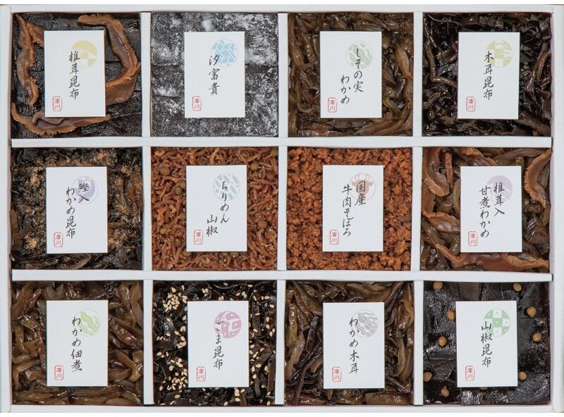 商品内容:ごま昆布70g・椎茸昆布70g・汐富貴20g・しその実わかめ70g・ちりめん山椒40g・椎茸入甘煮わかめ70g・山椒昆布60g・わかめ佃煮60g・国産牛肉そぼろ60g・鰹入わかめ昆布70g・わかめ木耳60g・木耳昆布60g×各1
