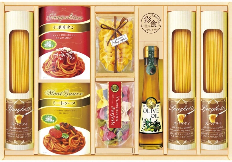商品内容:スパゲティ130g×3、マカロニ(コンキリエ)70g・自然色パスタ(ファルファーレ)40g・パスタソース(ナポリタン2人前・ミートソース2人前)250g・エクストラバージンオリーブオイル100g×各1