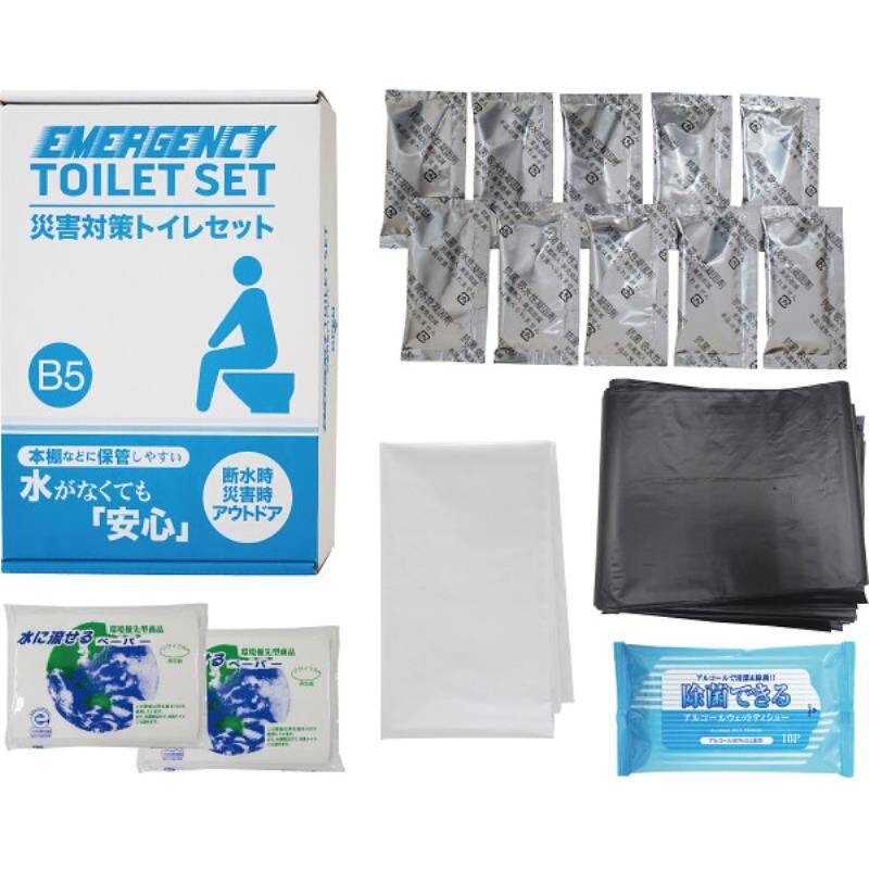●B5ファイルサイズ化粧箱入でコンパクトに備蓄可能なトイレ処理キット。