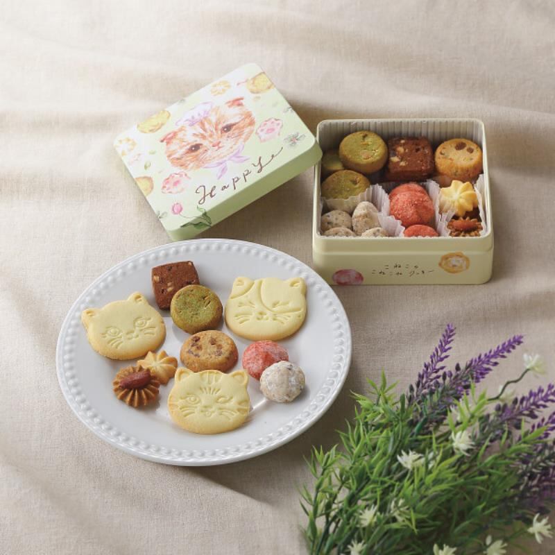 サクほろ食感のクッキーを詰め合わせたおすすめギフト缶です。5種類のクッキー、2種類のスノーボールクッキーの入ったバラエティ豊かな食感、フレーバーをお楽しみいただけます。猫クッキーのお顔は5種類あり、どの猫ちゃんが入っているかはお楽しみです!