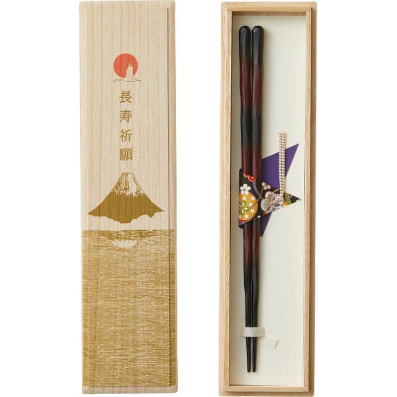 お箸は、究極の使いやすさと持ちやすさを追求した兵左衛門の代表作『けずり箸』の形状で、持ってみるとしっくりと手に馴染み、まるで指先でつまんでいるような使い心地のお箸です。素材に使用している木「あすなろ」は、非常に軽い点が特徴で、負担もかからず、持ちやすさをさらにグレードアップしてくれます。末広がりで縁起の良い富士山柄に長寿祈願の文字を配した桐箱入り。