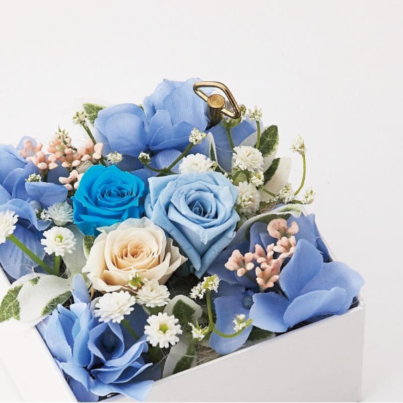 オリジナルボックスにアレンジしたオルゴール付きのプリザーブド&アーティフィシャルフラワーアレンジメント。オルゴールのメロディにのせて、美しい物語の世界観を感じられるオルゴールフラワーをお楽しみください。